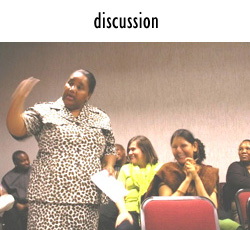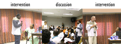 The video clip shows how Forum Theatre works: There is a warm-up before a typical problematic scenario is performed for the audience. The scenario/s show common interactions people consider problematic. When the play’s performed again, any audience member can stop the play and intervene by replacing one of the actors to try to deal with the situation in a more effective way. In fact, as participants intervene again and again, audience members discuss the interventions. Participants access and explore more and more effective options as they gain more and more insight in the synergy of their reflections.
